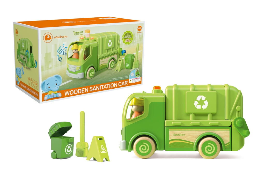 ntroducing the Wooden Recycle Truck with Sound and Light from Wanborns, a delightful, eco friendly toy that is as fun as it is educational. In a vibrant, eye catching green, this charming truck is crafted from ABS plastic with wood components, making it both sturdy and sustainable.